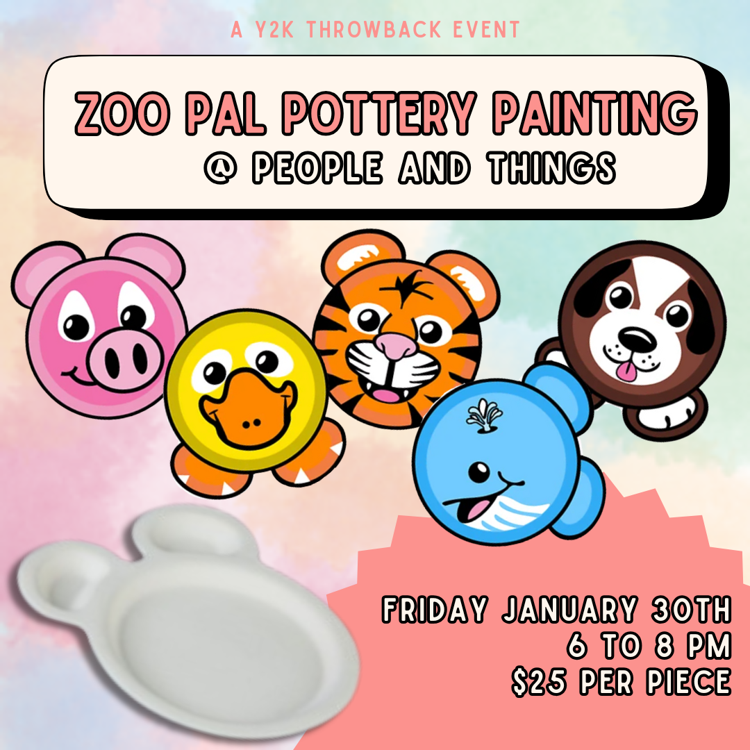 Throw it back to childhood lunches with a Zoo Pal pottery paint night at People and Things! We’ll be painting real food safe ceramic Zoo Pal plates inspired by the iconic animal designs. You’ll get to choose from a mix of playful animal faces, and we’ll be there to help bring your Zoo Pal to life.